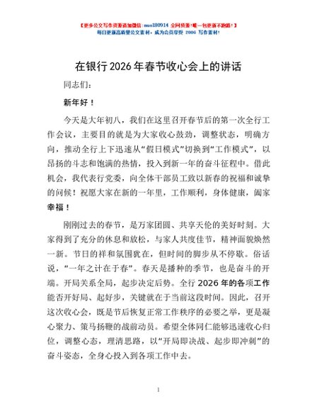 / 在银行2026年春节收心会上的讲话