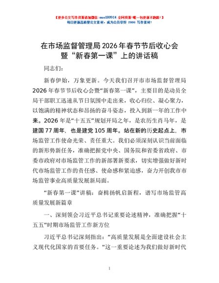 / 在市场监督管理局2026年春节节后收心会暨“新春第一课”上的讲话稿