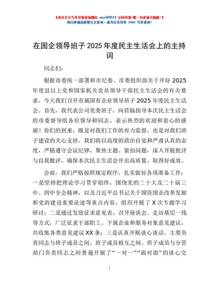 / 在国企领导班子2025年度民主生活会上的主持词