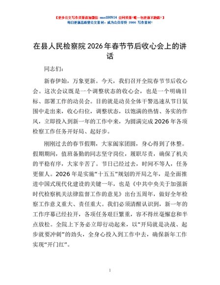 / 在县人民检察院2026年春节节后收心会上的讲话