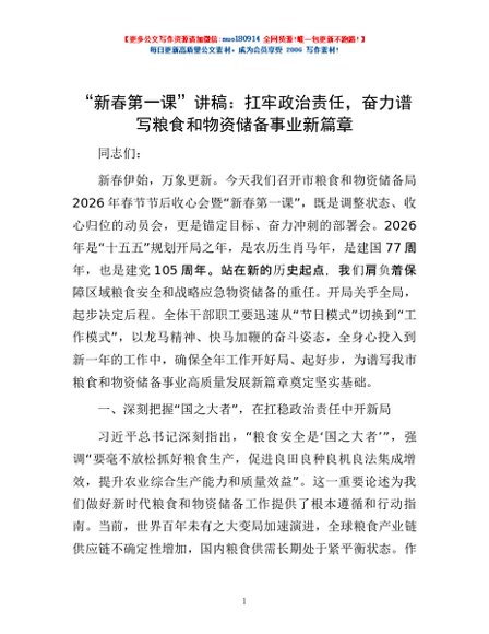 / “新春第一课”讲稿:扛牢政治责任,奋力谱写粮食和物资储备事业新篇章