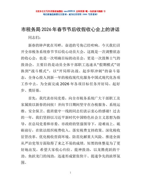 / 市税务局2026年春节节后收假收心会上的讲话