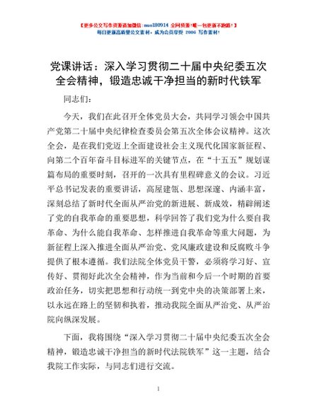 / 党课讲话:深入学习贯彻二十届中央纪委五次全会精神,锻造忠诚干净担当的新时代铁军