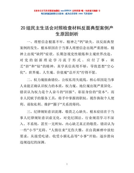 / 20组民主生活会对照检查材料反面典型案例产生原因剖析
