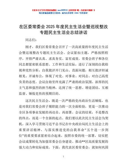 / 在区委常委会2025年度民主生活会暨巡视整改专题民主生活会总结讲话