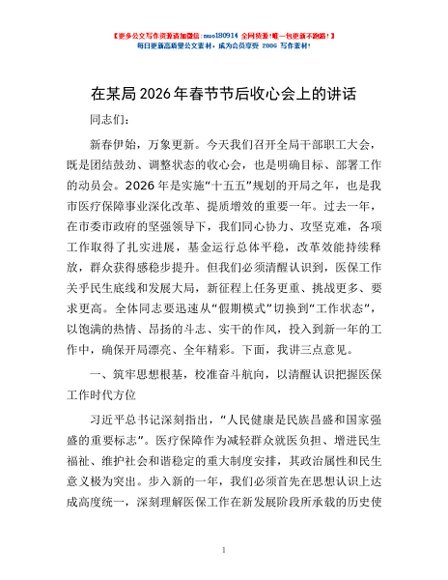 / 在某局2026年春节节后收心会上的讲话