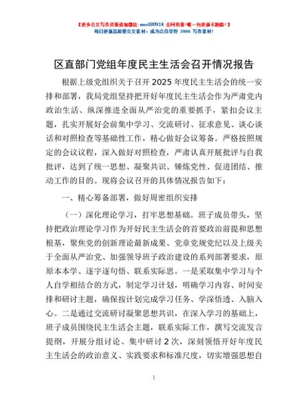 / 区直部门党组年度民主生活会召开情况报告