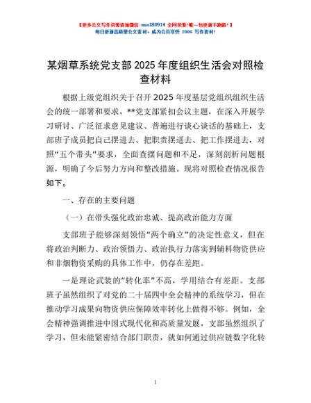 / 某烟草系统党支部2025年度组织生活会对照检查材料