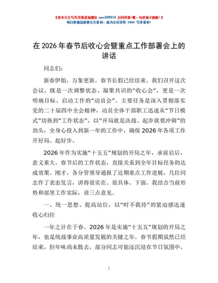 / 在2026年春节后收心会暨重点工作部署会上的讲话