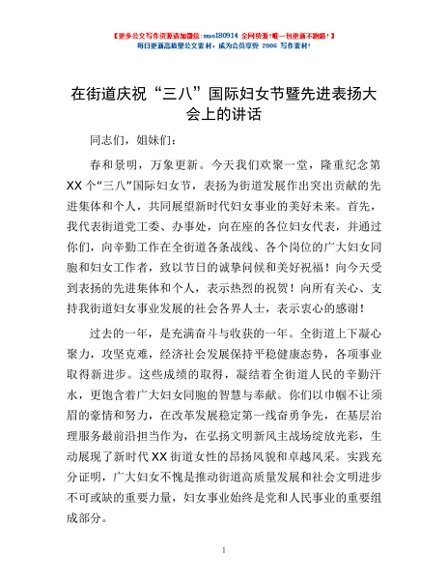 / 在街道庆祝“三八”国际妇女节暨先进表扬大会上的讲话