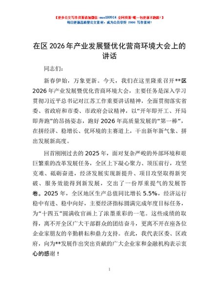 / 在区2026年产业发展暨优化营商环境大会上的讲话