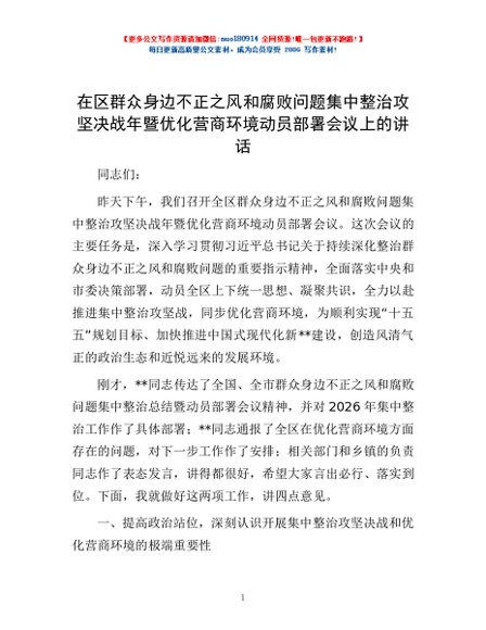 / 在区群众身边不正之风和腐败问题集中整治攻坚决战年暨优化营商环境动员部署会议上的讲话