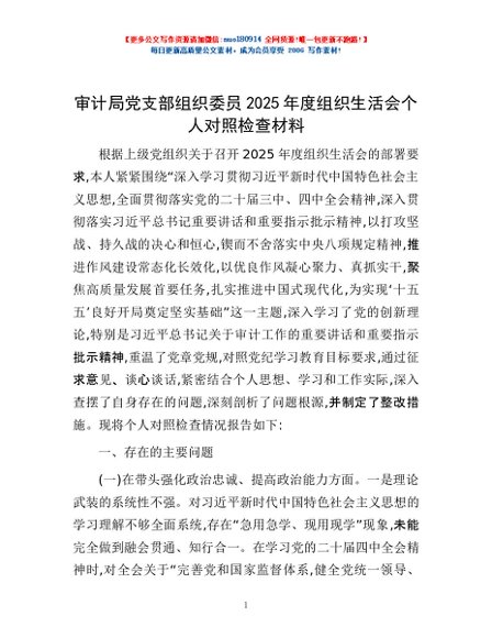 / 审计局党支部组织委员2025年度组织生活会个人对照检查材料