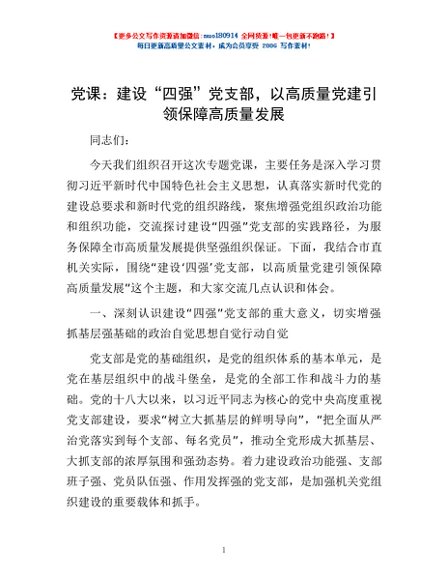 / 党课:建设“四强”党支部,以高质量党建引领保障高质量发展
