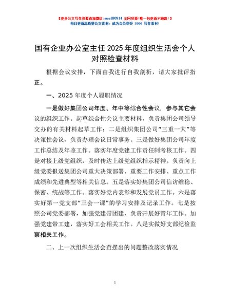 / 国有企业办公室主任2025年度组织生活会个人对照检查材料