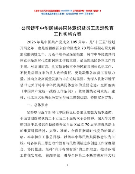 / 公司铸牢中华民族共同体意识暨员工思想教育工作实施方案