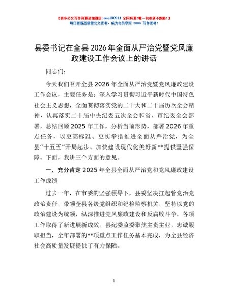 / 县委书记在全县2026年全面从严治党暨党风廉政建设工作会议上的讲话