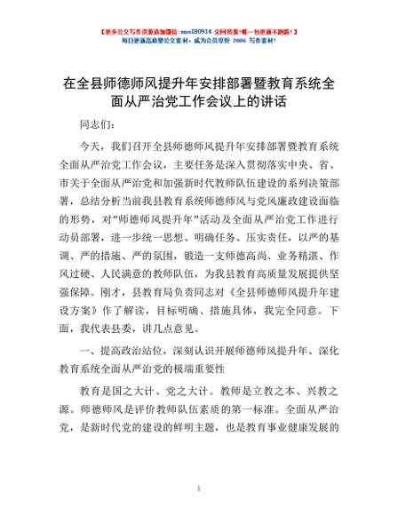 / 在全县师德师风提升年安排部署暨教育系统全面从严治党工作会议上的讲话