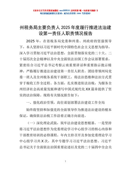/ 州税务局主要负责人2025年度履行推进法治建设第一责任人职责情况报告