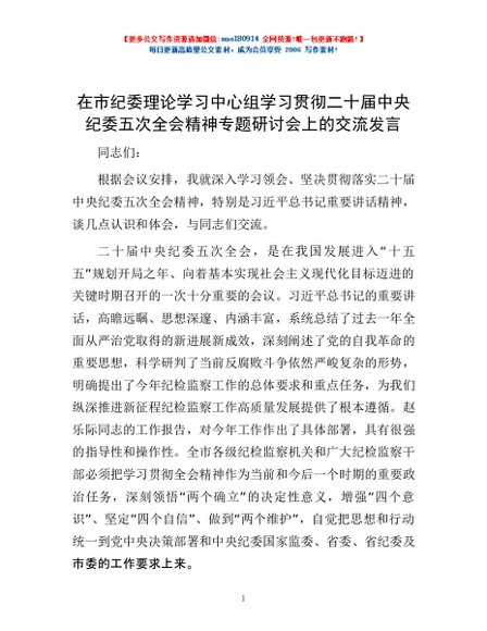 / 在市纪委理论学习中心组学习贯彻二十届中央纪委五次全会精神专题研讨会上的交流发言