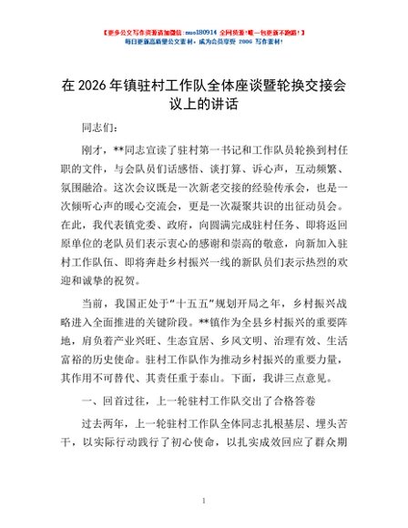 / 在2026年镇驻村工作队全体座谈暨轮换交接会议上的讲话