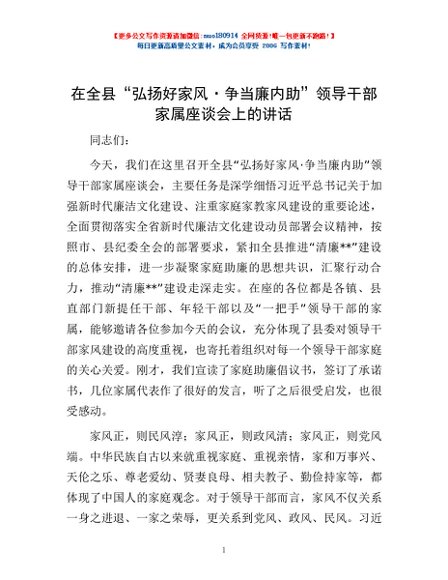 / 在全县“弘扬好家风·争当廉内助”领导干部家属座谈会上的讲话