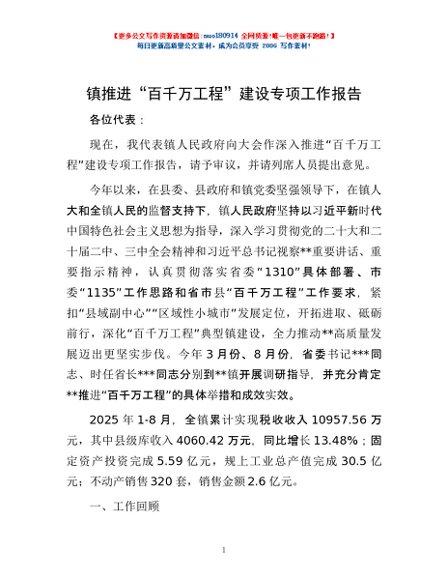 / 镇推进“百千万工程”建设专项工作报告