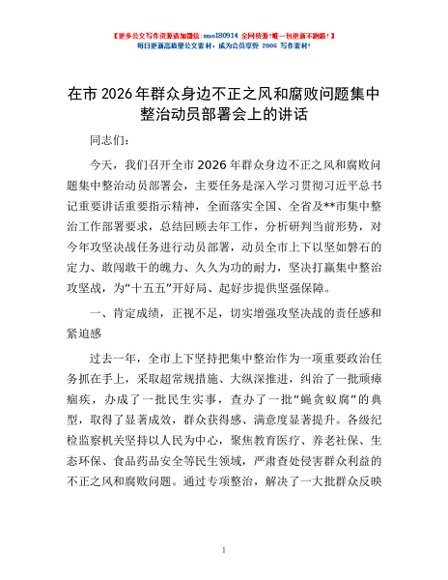 / 在市2026年群众身边不正之风和腐败问题集中整治动员部署会上的讲话