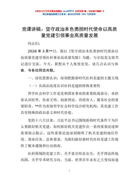 / 党课讲稿:坚守政治本色 勇担时代使命 以高质量党建引领事业高质量发展