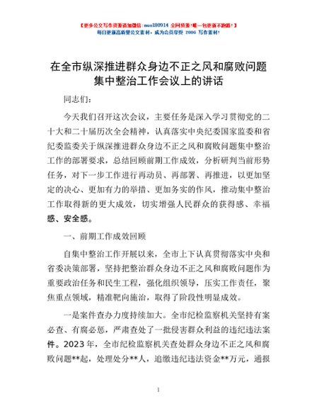 / 在全市纵深推进群众身边不正之风和腐败问题集中整治工作会议上的讲话