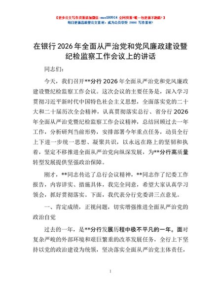 / 在银行2026年全面从严治党和党风廉政建设暨纪检监察工作会议上的讲话