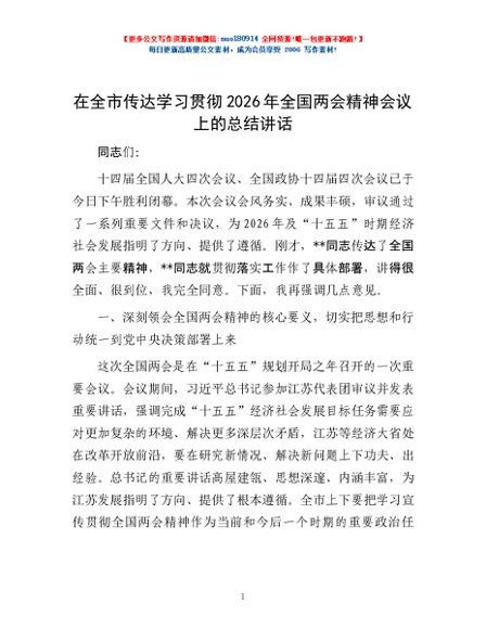 / 在全市传达学习贯彻2026年全国两会精神会议上的总结讲话