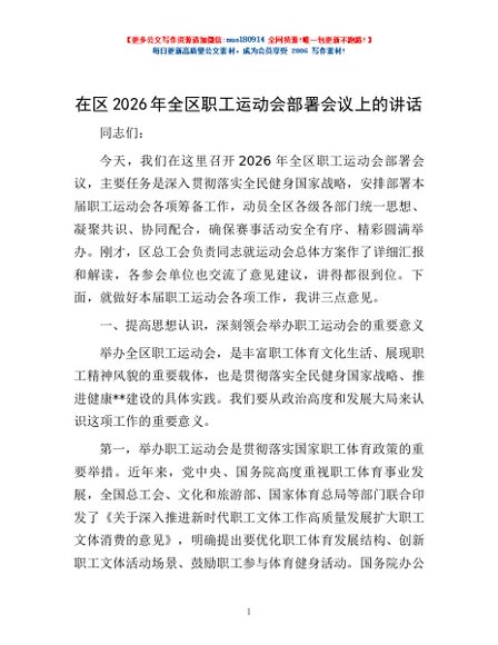 / 在区2026年全区职工运动会部署会议上的讲话