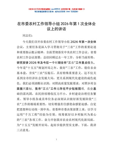 / 在市委农村工作领导小组2026年第1次全体会议上的讲话