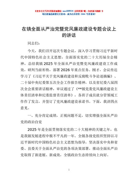 / 在镇全面从严治党暨党风廉政建设专题会议上的讲话