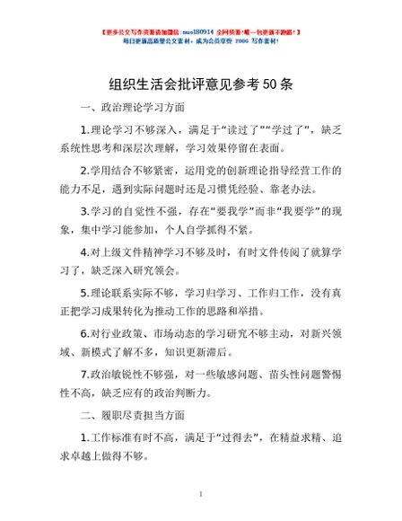 / 组织生活会批评意见参考50条