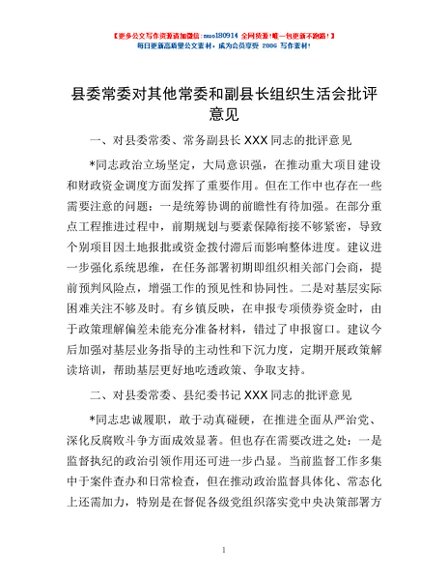 县委常委对其他常委和副县长组织生活会批评意见