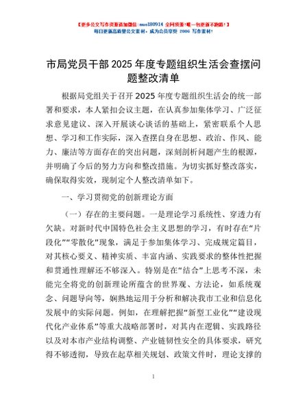 / 市局党员干部2025年度专题组织生活会查摆问题整改清单