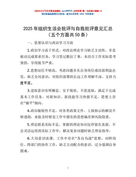 / 2025年组织生活会批评与自我批评意见汇总(五个方面共50条)