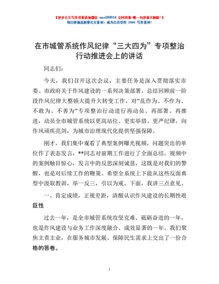 / 在市城管系统作风纪律“三大四为”专项整治行动推进会上的讲话