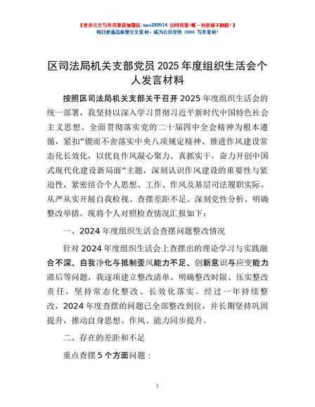 / 区司法局机关支部党员2025年度组织生活会个人发言材料