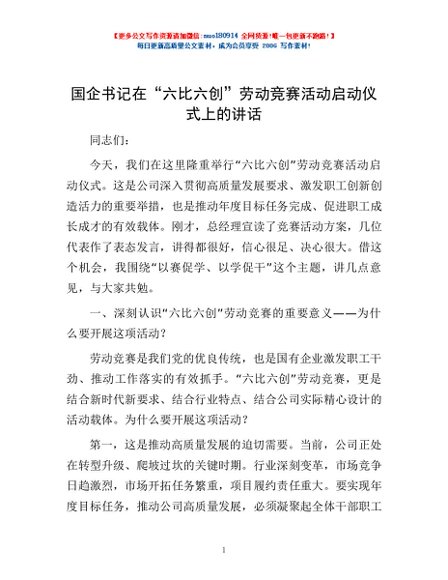/ 国企书记在“六比六创”劳动竞赛活动启动仪式上的讲话