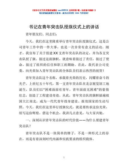 / 书记在青年突击队授旗仪式上的讲话