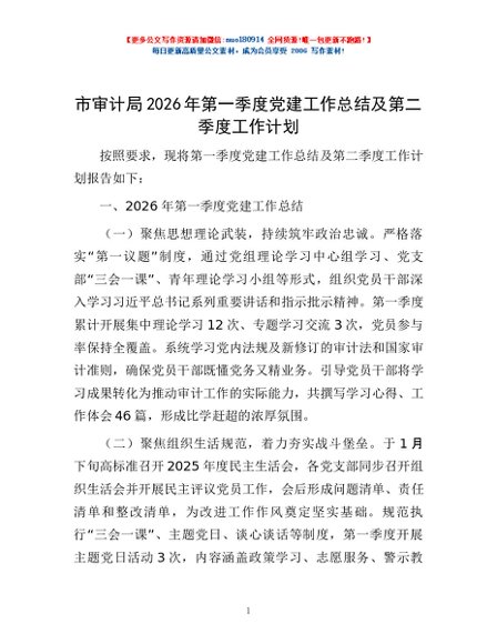 / 市审计局2026年第一季度党建工作总结及第二季度工作计划