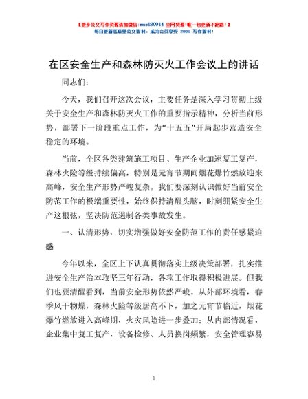 / 在区安全生产和森林防灭火工作会议上的讲话