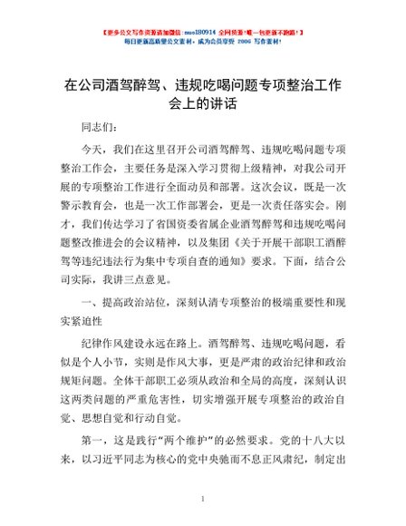 / 在公司酒驾醉驾、违规吃喝问题专项整治工作会上的讲话