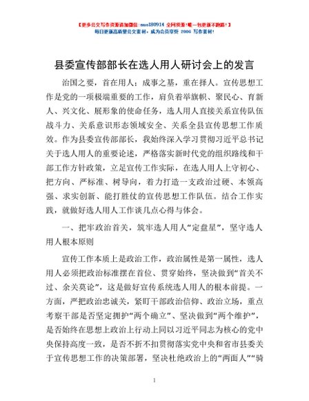 / 县委宣传部部长在选人用人研讨会上的发言