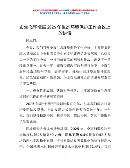 / 市生态环境局2026年生态环境保护工作会议上的讲话