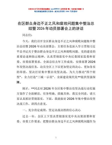 / 在区群众身边不正之风和腐败问题集中整治总结暨2026年动员部署会上的讲话