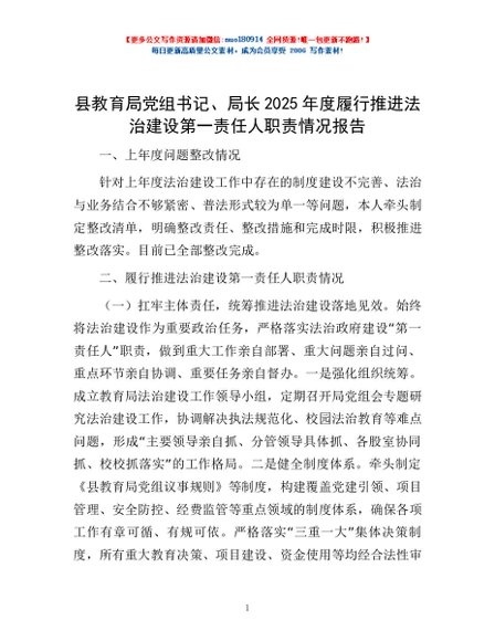 / 县教育局党组书记、局长2025年度履行推进法治建设第一责任人职责情况报告